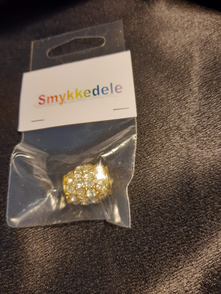 Flot stor metalperle i guldlook, fyldt med glinsende sten.
